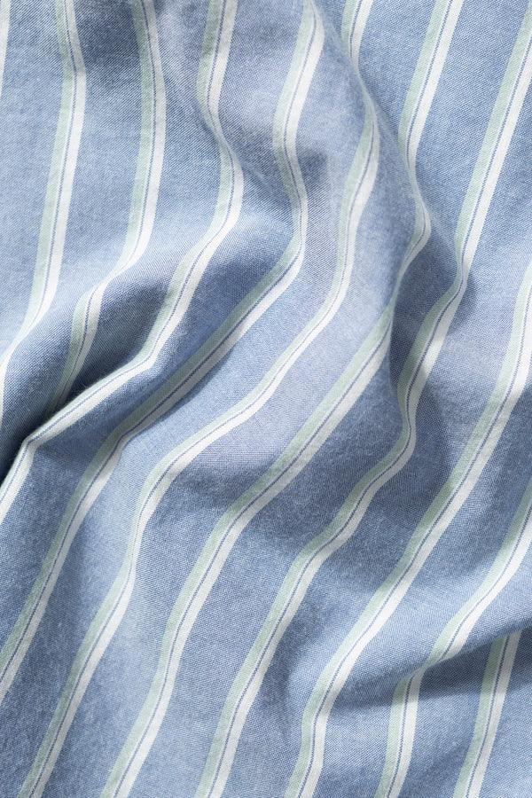 Hemd aus gebürsteter Baumwollpopeline mit hellblauem Streifenmuster. Ausgeschnittener Hals und lange Ärmel mit geknöpften Manschetten. Brusttasche. Knopfverschluss vorne. Hergestellt aus 100% Baumwolle. Hergestellt in Portugal.