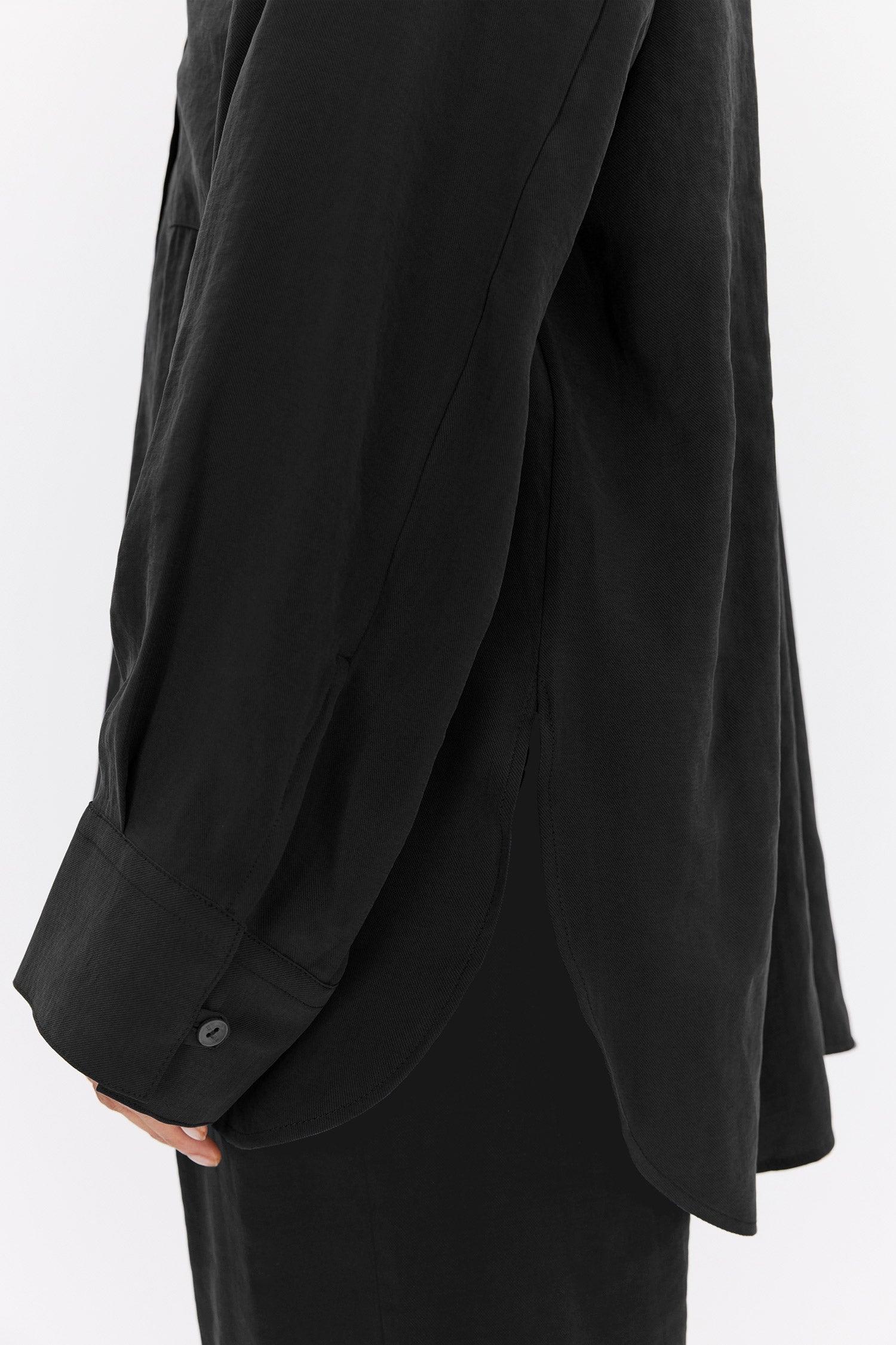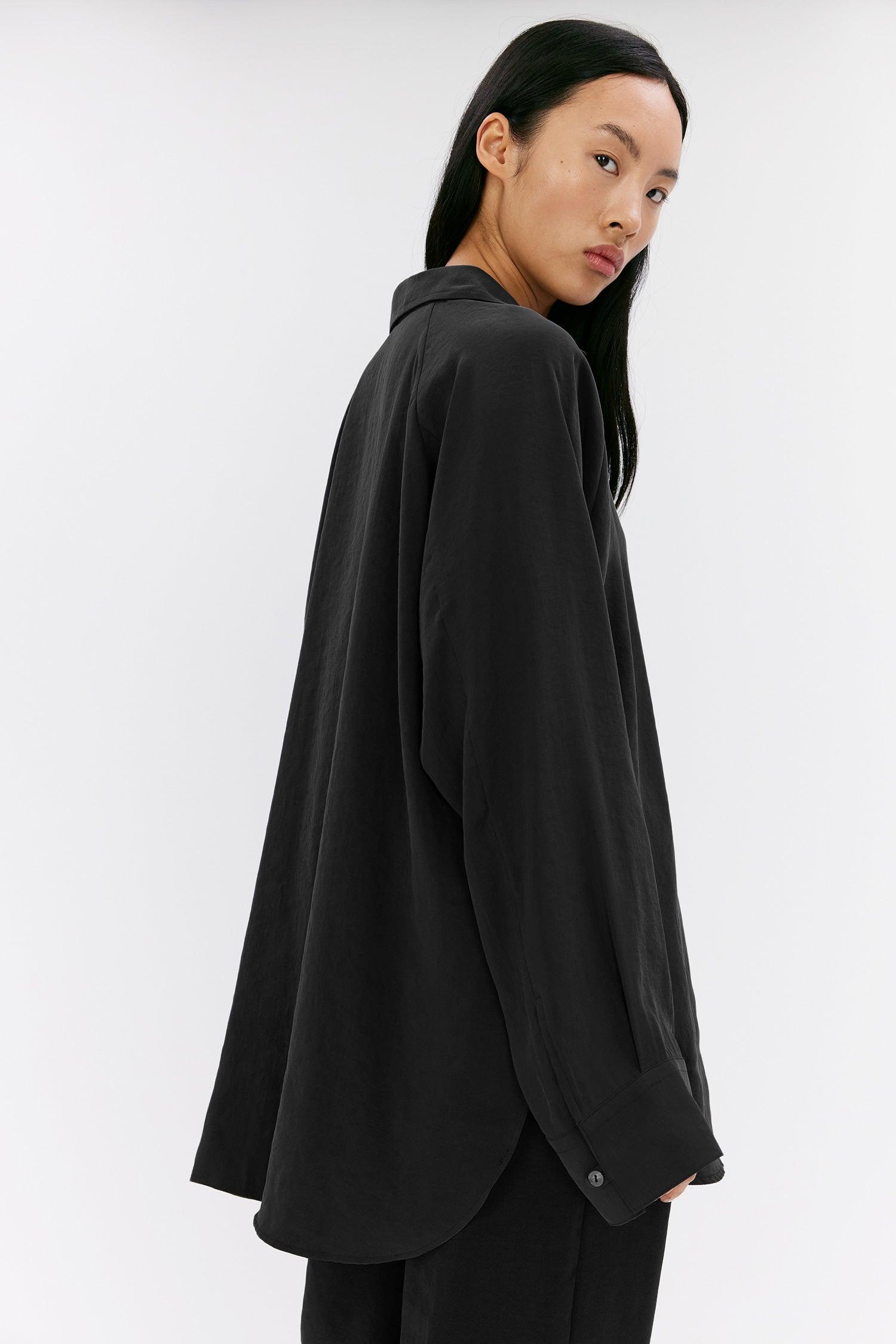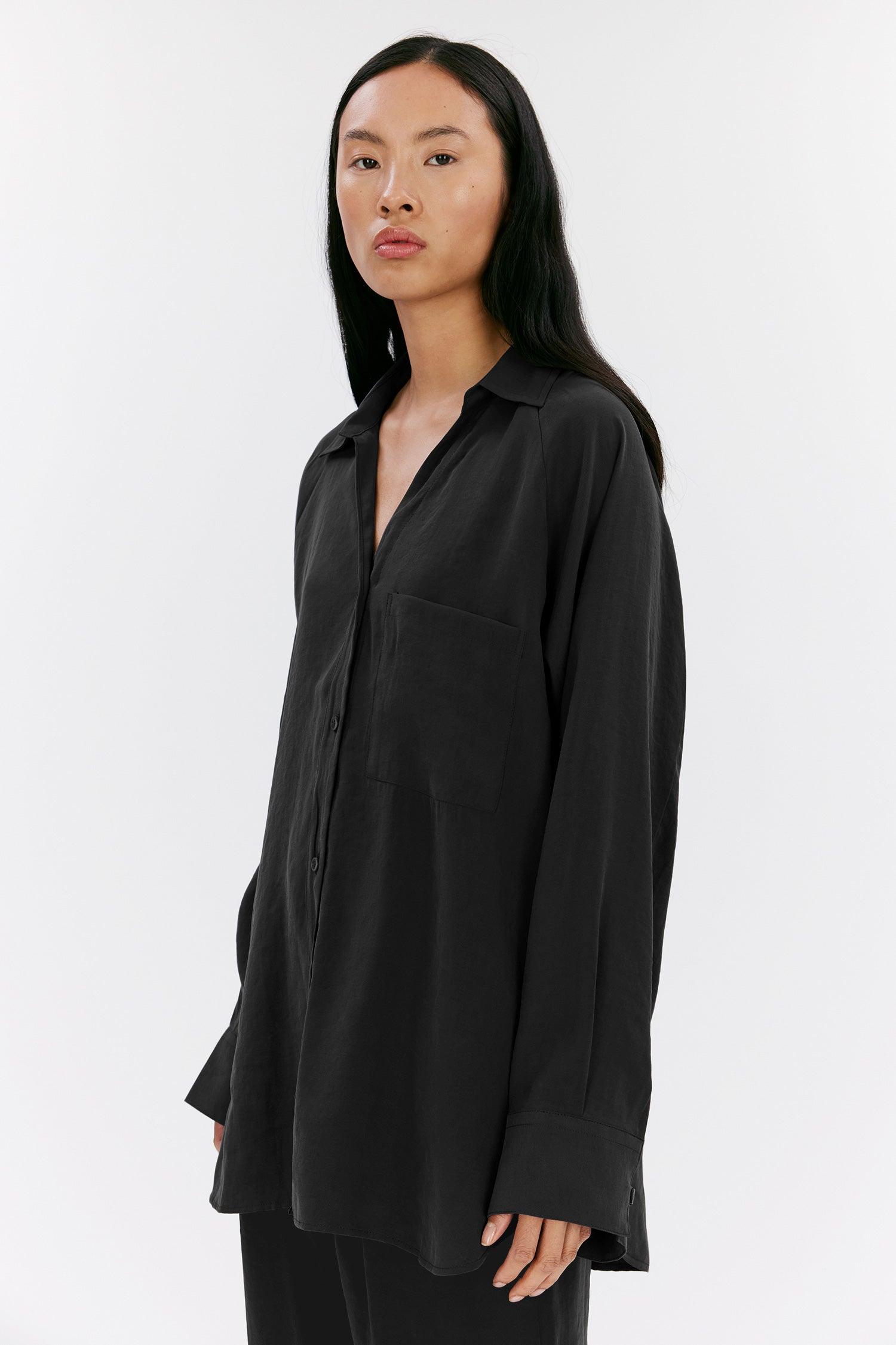 Milena ist ein Hemd mit lockerer Passform aus Modal-Mischgewebe. Das Material ist weich und fließend, was diesem Kleidungsstück ein Gefühl von Leichtigkeit verleiht. Zu den Details gehören ein offener V-Ausschnitt, Raglanärmel und ein gebogener Saum mit hohen Schlitzen an den Seiten.